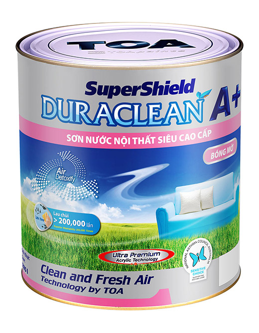 Sơn nước nội thất siêu cao cấp SuperShield DuraClean A+ bóng mờ được chế tạo từ nhựa Acrylic nguyên chất, mang đến tính năng dễ lau chùi nên không lưu lại vết bẩn sau khi lau. Công nghệ Air Detoxify giúp chuyển hóa Phoóc-môn trong không khí thành hơi nước mang đến chất lượng không khí trong nhà trong lành nhất, mùi rất nhẹ. Hơn nữa, màng Sơn TOA có khả năng kháng khuẩn lâu dài với công nghệ Microban mà không gây tác hại cho con người. Khả năng chống nấm mốc tuyệt vời với hàm lượng chất hữu cơ bay hơi (V.O.C) gần như bằng không.