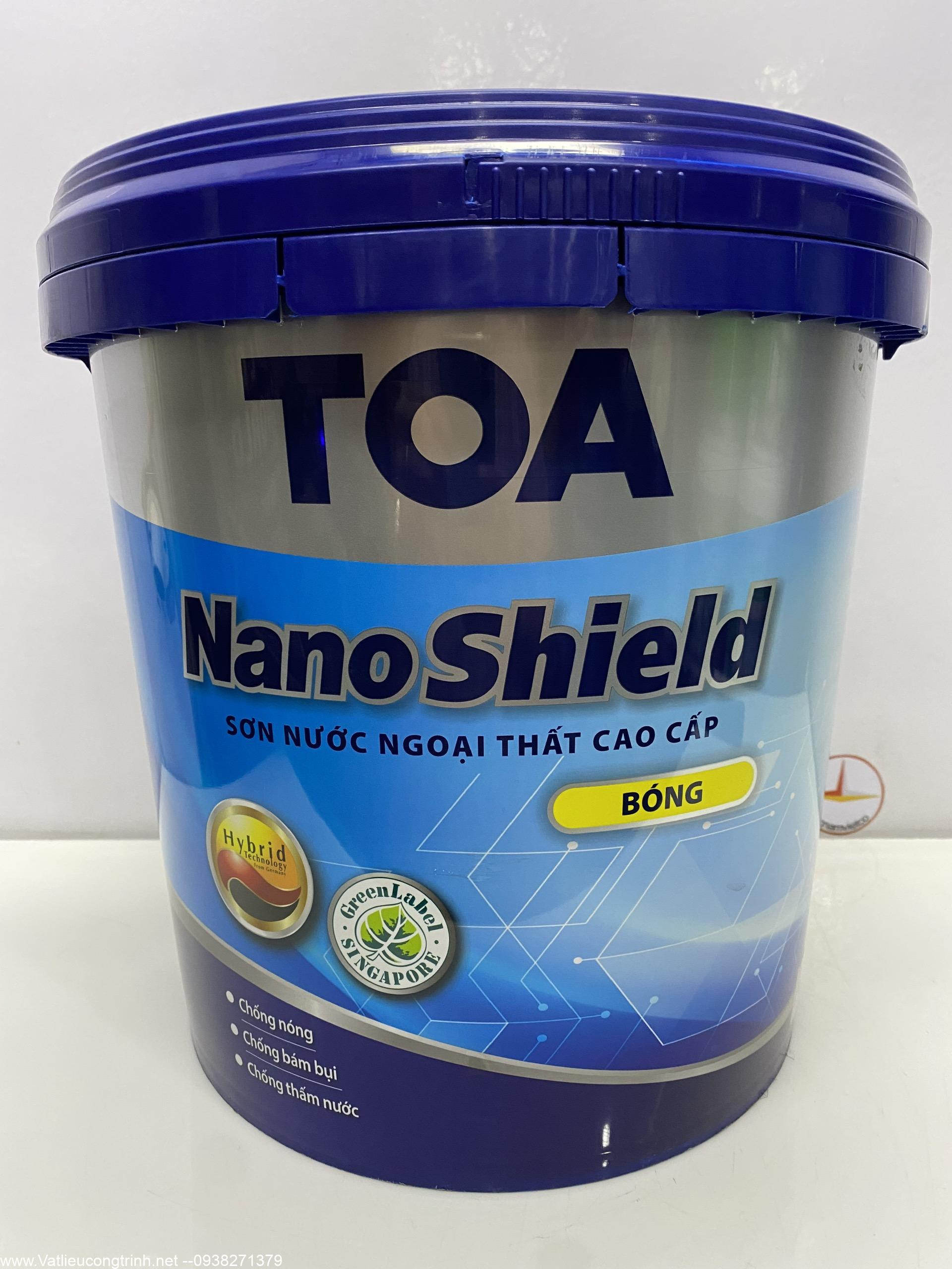 Sơn nước ngoại thất cao cấp TOA NanoShield được chế tạo từ nhựa Acrylic nguyên chất với công nghệ tiên tiến Graphene Hybrid Nano giúp chống thấm nước vượt trội, chống bám bụi, chống phai màu, kháng mài mòn và độ bền thời tiết rất cao ngay cả trong điều kiện thời tiết khắc nghiệt nhất, bảo vệ công trình lên đến 10 năm. Công nghệ cấu trúc hạt Graphene Hybrid Nano từ Đức với kích thước 1 phần tỷ mét (nanomet) làm tăng độ cứng của màng sơn, giúp chống bám bẩn và chống thấm hoàn hảo, bảo vệ ngôi nhà khỏi những tác động của nắng mưa, ẩm ướt,… giúp ngôi nhà luôn mới. TOA NanoShield được chứng nhận là sản phẩm xanh, thân thiện với môi trường. Không sử dụng chì và thủy ngân trong công thức sản xuất. Ngoài ra, TOA NanoShield còn có những tính năng đặc biệt khác như: màng sơn không phồng rộp, bong tróc, chống rêu mốc, độ phủ cao, độ che lấp tốt, màu sắc bền lâu…