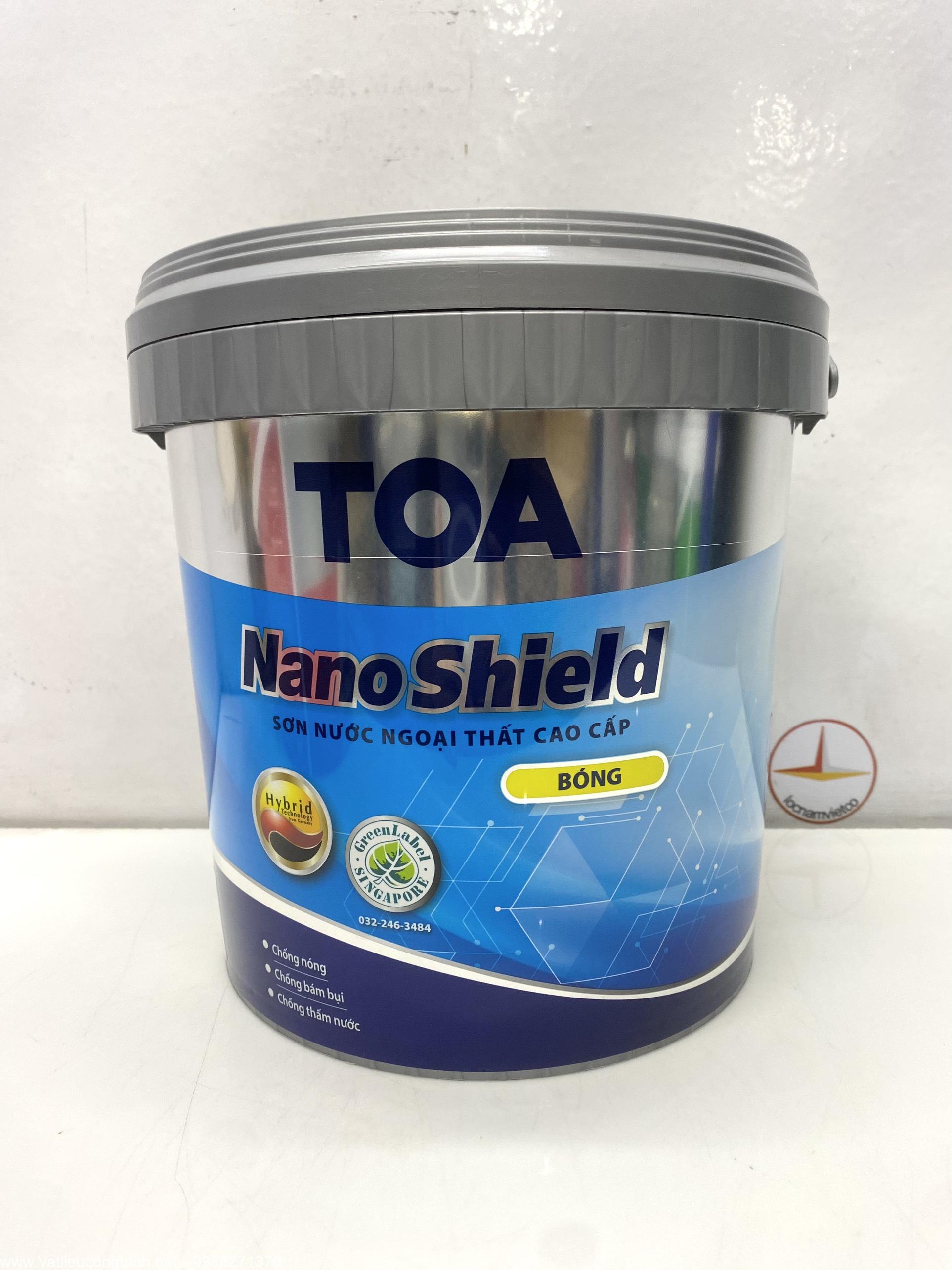 Sơn nước ngoại thất cao cấp TOA NanoShield được chế tạo từ nhựa Acrylic nguyên chất với công nghệ tiên tiến Graphene Hybrid Nano giúp chống thấm nước vượt trội, chống bám bụi, chống phai màu, kháng mài mòn và độ bền thời tiết rất cao ngay cả trong điều kiện thời tiết khắc nghiệt nhất, bảo vệ công trình lên đến 10 năm. Công nghệ cấu trúc hạt Graphene Hybrid Nano từ Đức với kích thước 1 phần tỷ mét (nanomet) làm tăng độ cứng của màng sơn, giúp chống bám bẩn và chống thấm hoàn hảo, bảo vệ ngôi nhà khỏi những tác động của nắng mưa, ẩm ướt,… giúp ngôi nhà luôn mới. TOA NanoShield được chứng nhận là sản phẩm xanh, thân thiện với môi trường. Không sử dụng chì và thủy ngân trong công thức sản xuất. Ngoài ra, TOA NanoShield còn có những tính năng đặc biệt khác như: màng sơn không phồng rộp, bong tróc, chống rêu mốc, độ phủ cao, độ che lấp tốt, màu sắc bền lâu…